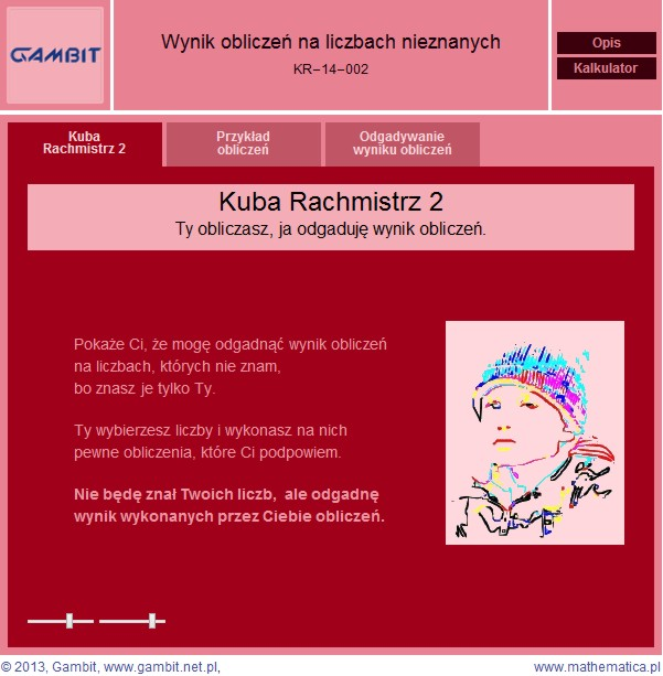 | Tutaj, wykonując kolejne polecenia Kuby, dokonasz obliczeń. Liczby do obliczeń wybierasz samodzielnie i najlepiej zapisuj je na kartce papieru. Kuba nie będzie znał tych liczb. |